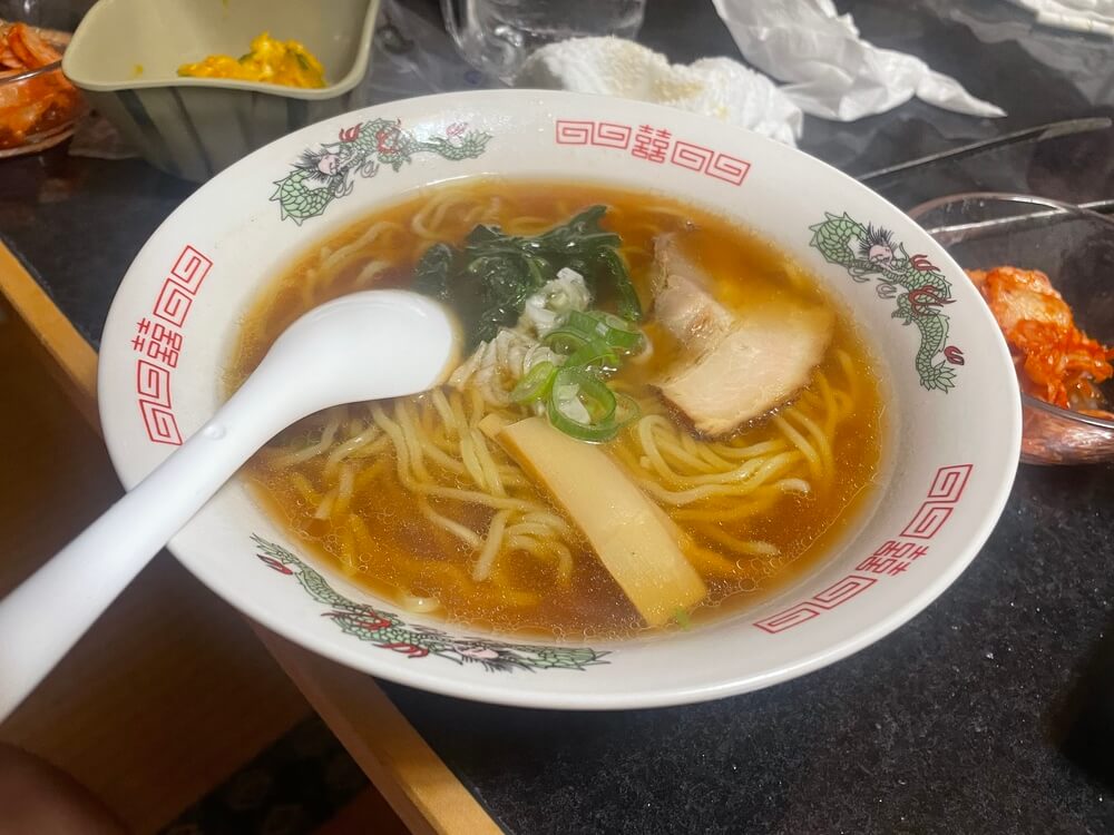 お肉だけでなく、サイドメニューも充実していました。外はカリッと、中はモチモチのチヂミ、あっさりとした醤油ベースのラーメン、そして箸休めにぴったりのキムチやナムルなど、どれも美味しく、最後まで満足感が続きました。特にラーメンは、同窓会メンバーからも「シメにラーメンまで食べられるなんて最高!」と大好評でした。